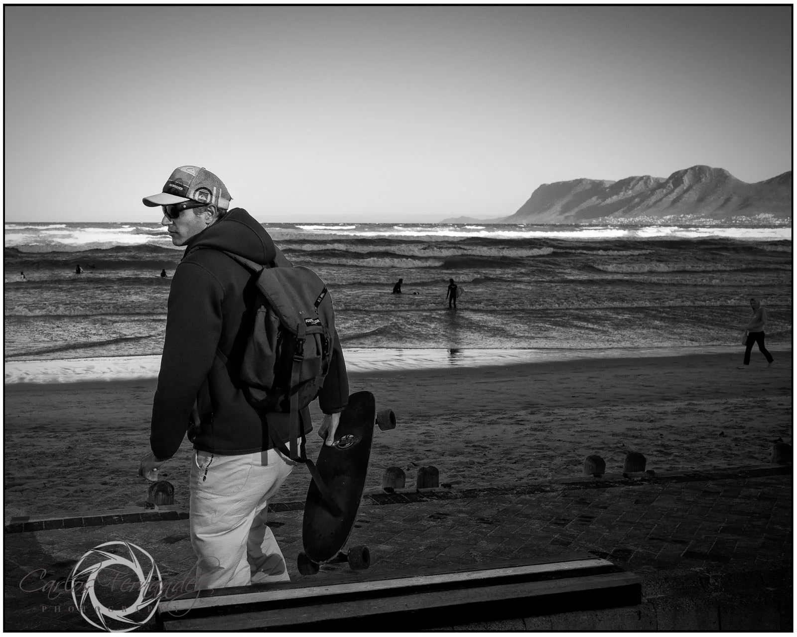 I made a couple of images of this Skateboarder while he was sitting. I liked the scene from behind him as he was looking out toward Muizenberg Beach, False Bay, and the Cape of Good Hope in the background. Yes, nothing but water between here and Antarctica. But I preferred this image as it is more dynamic. I like the way he is turning away, almost as if he is turning away from surfing to go Skateboard, while the girl in the bottom is entering the frame. Or maybe he has to go use the restroom LOL! Muizenberg is the beach and the town, however, False Bay is the body of water that it fronts. There is a small granite island in the bay called Seal Island, which is one of the main breeding sites for the Cape Fur Seal. The seals attract many Great White Sharks and some of the biggest sharks ever seen have been spotted in these waters. These sharks are famous for the manner in which they breach the surface of the water while attacking seals, sometimes jumping entirely out of the ocean. Despite this, swimming, surfing, yachting, scuba diving and so on are popular pastimes around the bay, at centres such as Muizenberg, Kalk Bay, Smitswinkel Bay, Strand and Gordon's Bay. Shark attacks are generally uncommon but by no means unknown, with two deaths since 2010. Skateboarder on Muizenberg Beach - 137/365